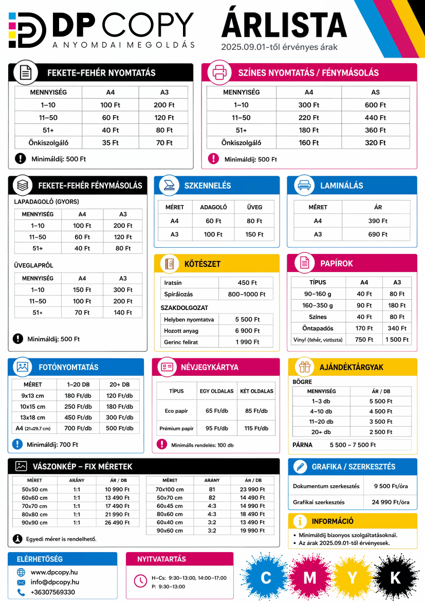 A feltüntetett árak kizárólag tájékoztató jellegűek, és nem minősülnek hivatalos ajánlatnak. Pontos árajánlat kizárólag a feladat részletes, írásos ismertetését követően, a visszakövethetőség érdekében adható. Az árak alanyi adómentesek, és 2024. november 13-tól érvényesek.